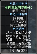 副本『奪回聖誕禮物大作戰』的專用道具,可用於補充場內的「守護水晶、偷來的聖誕禮物」少量的HP。