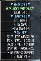 副本『奪回聖誕禮物大作戰』的專用道具,可用於補充場內的「守護水晶、偷來的聖誕禮物」大量的HP。