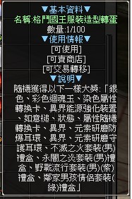 銀色迴魂玉 11%彩色迴魂玉 4%染色屬性轉換卡 15%異界能源強化裝置 10%如意槌 10%狀態隨機轉換卡 10%屬性隨機轉換卡 5%異界研磨防爆耳環 10%元素研磨防爆耳環 5%異界研磨守護耳環 10%元素研磨守護耳環 5%野戰流行套裝(男)(紫)禮盒 2%鄰家男孩情侶套裝(綠)禮盒 2%不滅之火套裝(男)禮盒 0.5%永闇之炎套裝(男)禮盒 0.5%