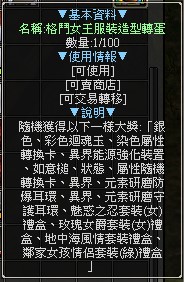 銀色迴魂玉 11%彩色迴魂玉 4%染色屬性轉換卡 15%異界能源強化裝置 10%如意槌 10%狀態隨機轉換卡 10%屬性隨機轉換卡 5%異界研磨防爆耳環 10%元素研磨防爆耳環 5%異界研磨守護耳環 10%元素研磨守護耳環 5%可愛女僕套裝(桃紅)禮盒 2%鄰家女孩情侶套裝(綠)禮盒 2%魅惑之忍套裝(女)禮盒 0.5%玫瑰女爵套裝(女)禮盒 0.5%