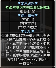 銀色迴魂玉 12%彩色迴魂玉 5%染色屬性轉換卡 16%如意槌 11%狀態隨機轉換卡 11%屬性隨機轉換卡 6%異界研磨防爆耳環 11%元素研磨防爆耳環 6%異界研磨守護耳環 11%元素研磨守護耳環 6%[造型]無雙方天戟-刀 0.96%[造型]無雙方天戟-劍 0.96%[造型]無雙方天戟-拳 0.96%[造型]無雙方天戟-弓 0.96%[造型]無雙方天戟-槍 0.96%心情圖片-一騎當千 0.2%