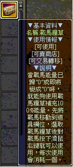 當戰馬能量已歸"0"或即將變成"0"時,就能夠使用戰馬糧草補充100%能量。先將戰馬移動到道具欄位,選取戰馬糧草後對戰馬按下滑鼠右鍵就可以使用,每次使用會消耗一個。