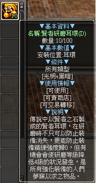 配載此耳環之後,在+4以上至+12等級精煉、研磨時,在研磨時不只可以防止裝備消失,更能防止裝備精練強度歸0,但有機會會使研磨等級降低1~4級,每次精煉、研磨後將消耗一個次數。