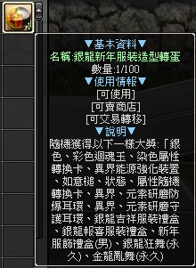 隨機獲得以下一樣大獎:「銀色、彩色迴魂玉、染色屬性轉換卡、異界能源強化裝置、如意槌、狀態、屬性隨機轉換卡、異界、元素研磨防爆耳環、異界、元素研磨守護耳環、銀龍吉祥服裝禮盒、銀龍報喜服裝禮盒、新年服飾禮盒(男)、銀龍狂舞(永久)、金龍亂舞(永久)