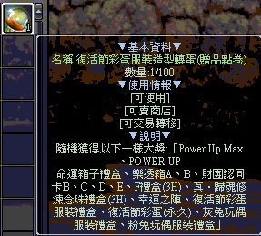 隨機獲得以下一樣大獎:「Power Up Max、POWER UP 命運箱子禮盒、樂透箱A、B、財團認同卡B、C、D、E、F禮盒(3H)、真•歸魂修煉念珠禮盒(3H)、幸運之陣、復活節彩蛋服裝禮盒、復活節彩蛋(永久)、灰兔玩偶服裝禮盒、粉兔玩偶服裝禮盒」
