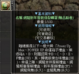 隨機獲得以下一樣大獎:「銀色、彩色迴魂玉、染色屬性轉換卡、異界能源強化裝置、如意槌、狀態、屬性隨機轉換卡、異界、元素研磨防爆耳環、異界、元素研磨守護耳環、銅龍吉祥服裝禮盒、銅龍報喜服裝禮盒、新年服飾禮盒(女)、銅龍飛舞(永久)、金龍亂舞(永久)