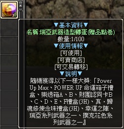 隨機獲得以下一樣大獎:「Power Up Max、POWER UP 命運箱子禮盒、樂透箱A、B、財團認同卡B、C、D、E、F禮盒(3H)、真•歸魂修煉念珠禮盒(3H)、幸運之陣、瑞亞系列武器之一、撲克花色系列武器之一』